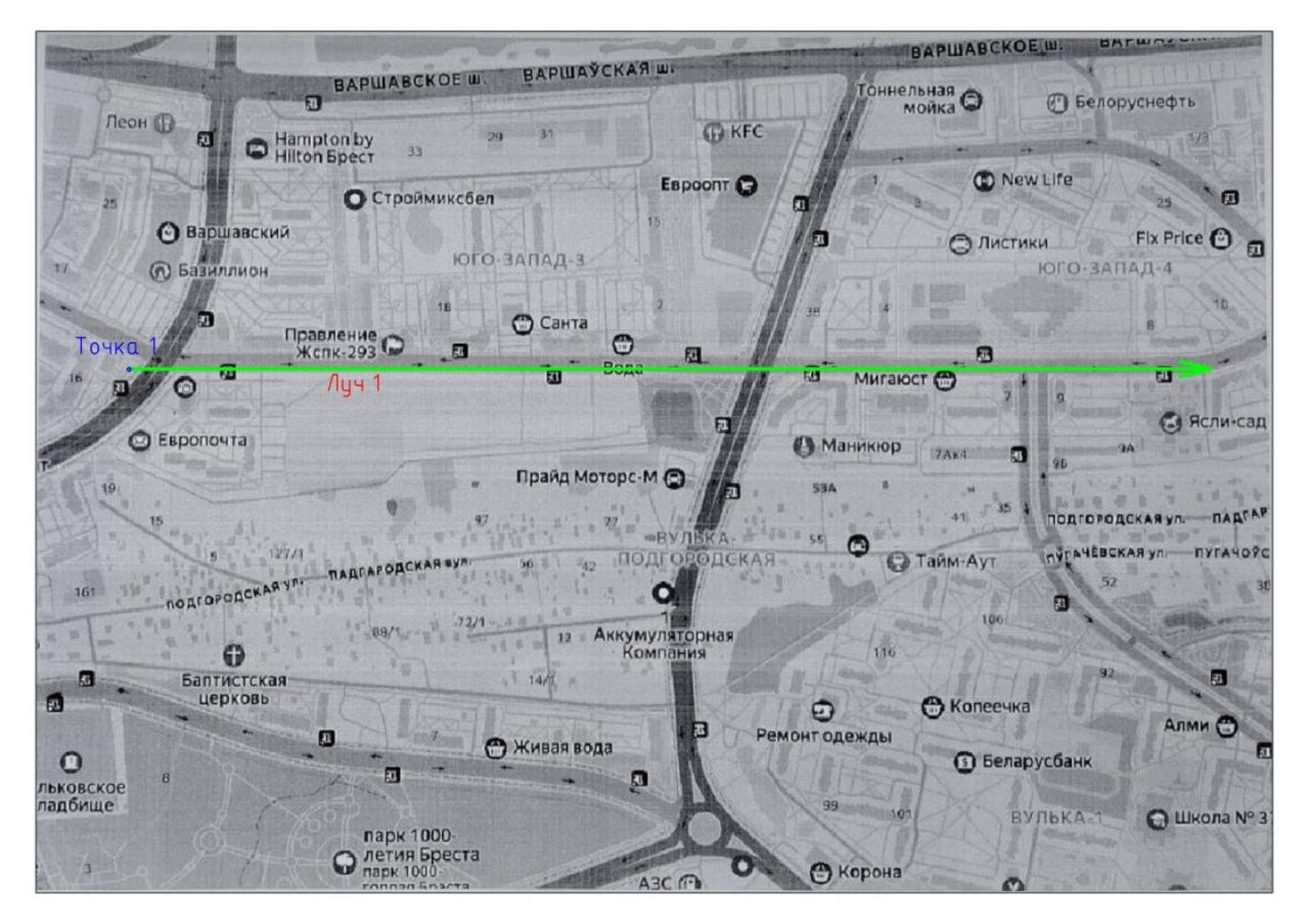 Из точки 1 строим луч 1 под углом 0°.