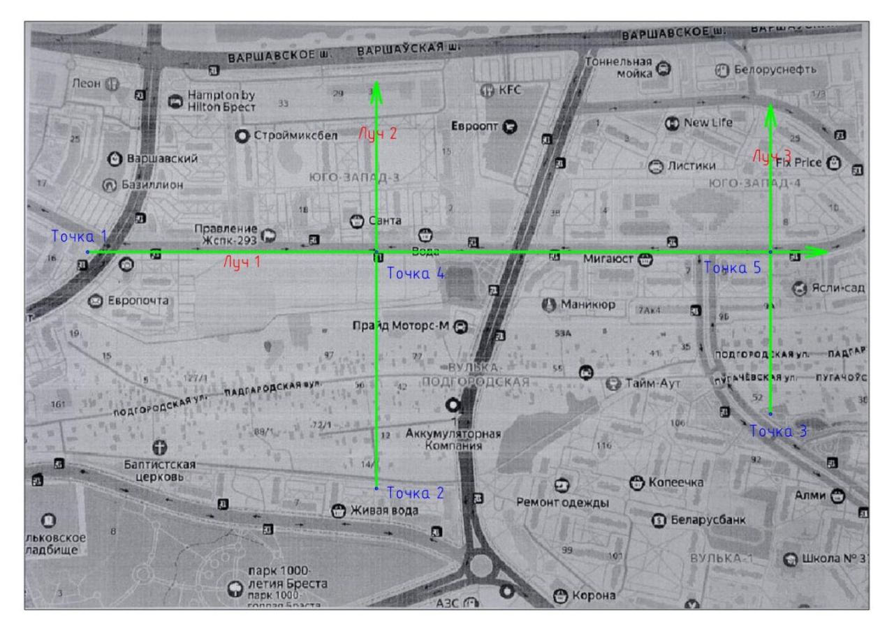 луч 1 + луч 3 = точка 5